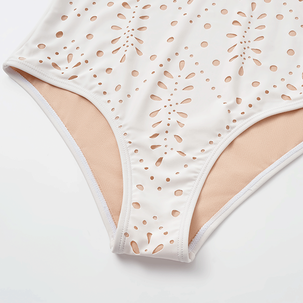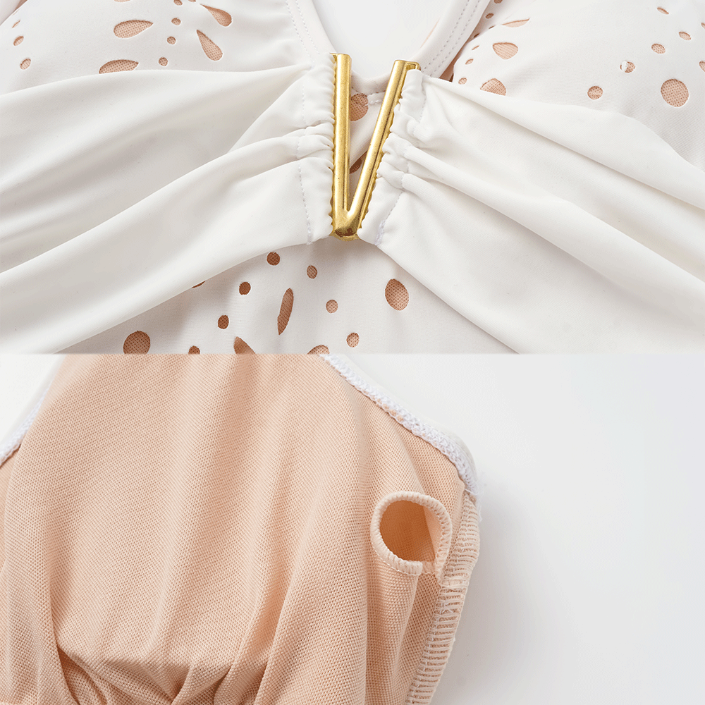 V Neck Solid Color Laser Cutting Flower One Piece Swimsuit and Skirt